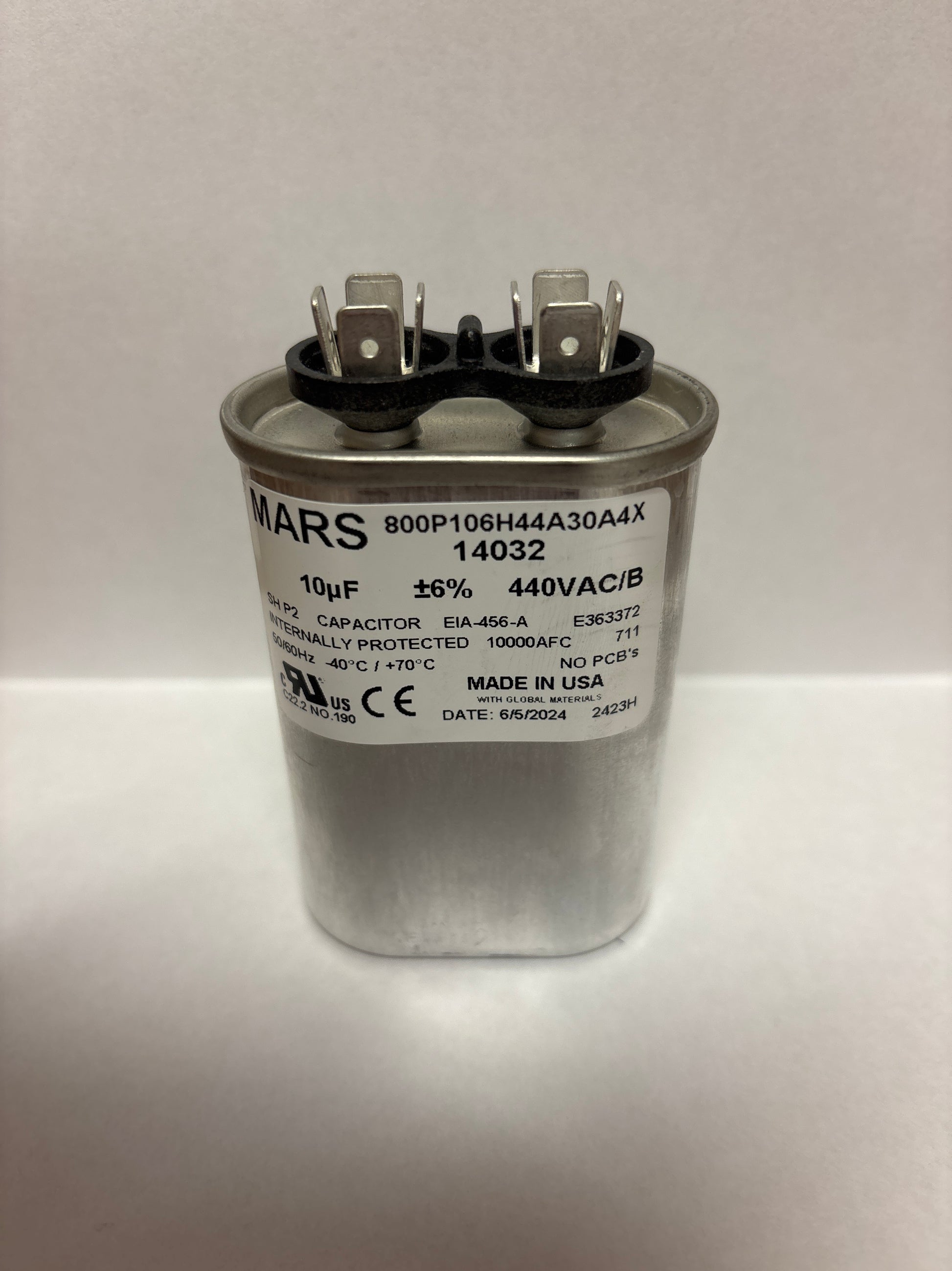 Capacitor Type Single Capacitance Shape Oval MFD Rating 10 Voltage 440/370 Hz 50/60 Case Height (in.) 3 Width (in.) 2.16 Overall Height (in.) 3.5 Depth (in.) 1.31 Temp. Range -40°C to +70°C Operational Life 60,000 Hrs. Terminals 4 Composition Aluminum