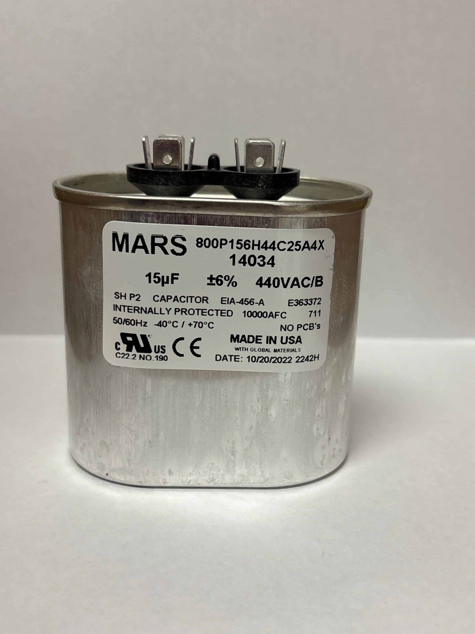 Capacitor Type Single Capacitance Shape Oval MFD Rating 15 Voltage 440/370 Hz 50/60 Case Height (in.) 2.63 Width (in.) 2.91 Overall Height (in.) 3.13 Depth (in.) 1.91 Temp. Range -40°C to +70°C Operational Life 60,000 Hrs. Terminals 4 Composition Aluminum