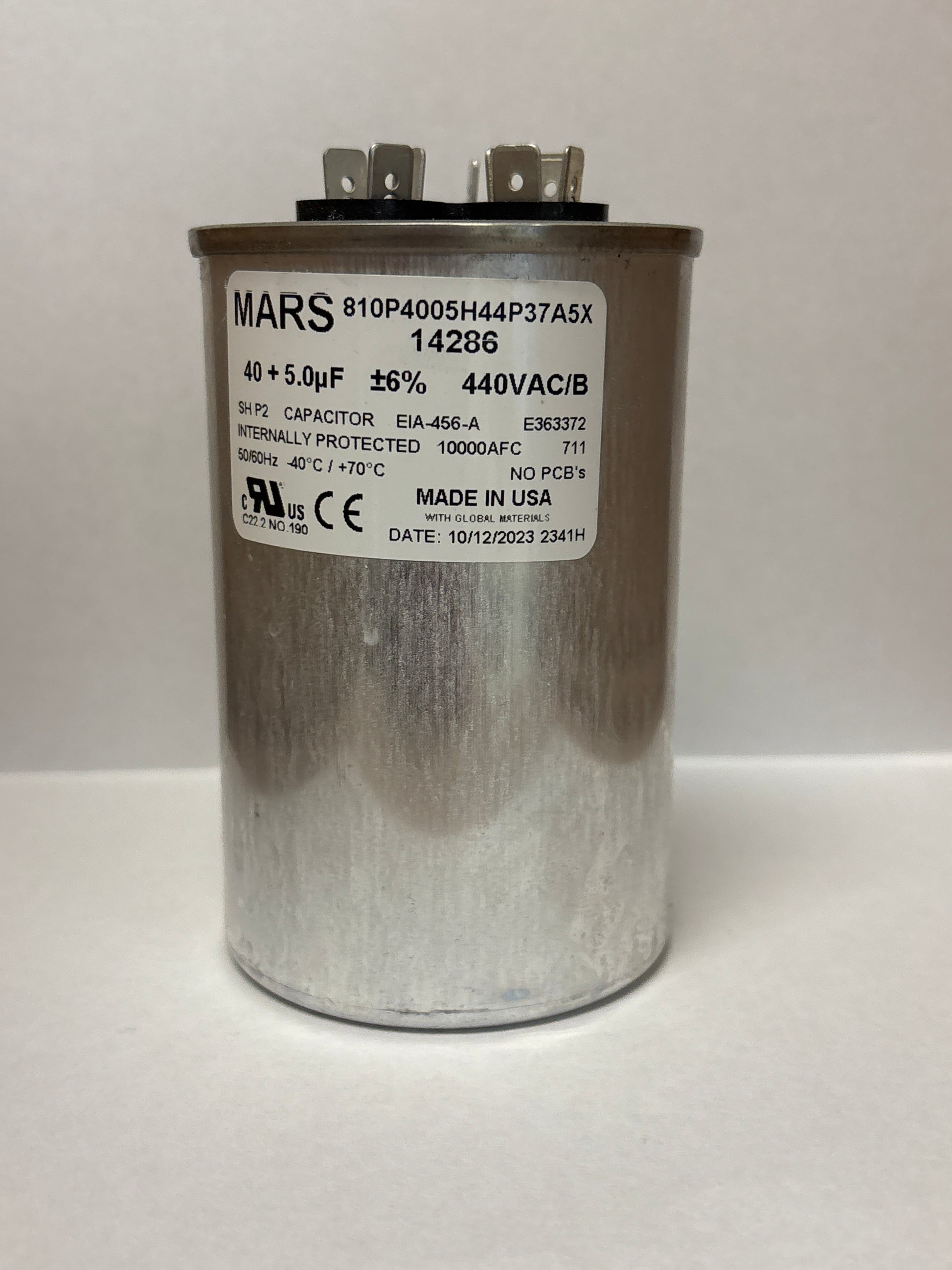 Capacitor Type Dual Capacitance Shape Round MFD Rating 40/5 Voltage 440/370 Hz 50/60 Case Height (in.) 3.88 Width (in.) 2.5 Overall Height (in.) 4.38 Temp. Range -40°C to +70°C Operational Life 60,000 Hrs. Terminals 4, 3, 2 Composition Aluminum