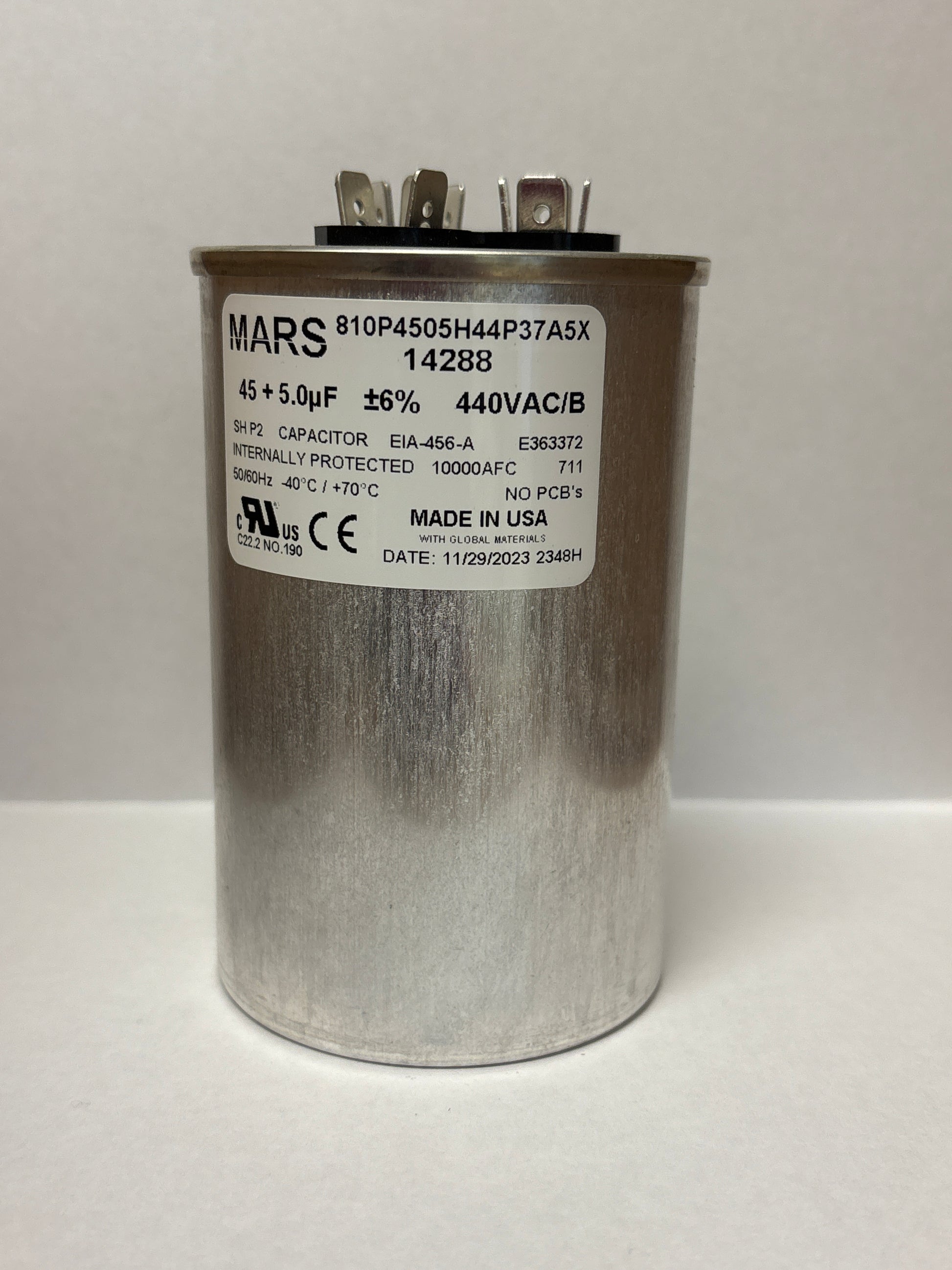Capacitor Type Dual Capacitance Shape Round MFD Rating 45/5 Voltage 440/370 Hz 50/60 Case Height (in.) 3.88 Width (in.) 2.5 Overall Height (in.) 4.38 Temp. Range -40°C to +70°C Operational Life 60,000 Hrs. Terminals 4, 3, 2 Composition Aluminum